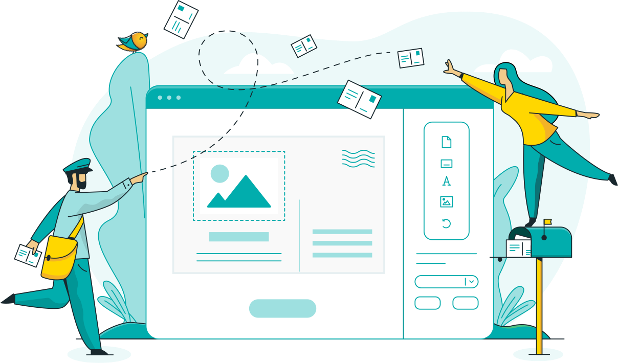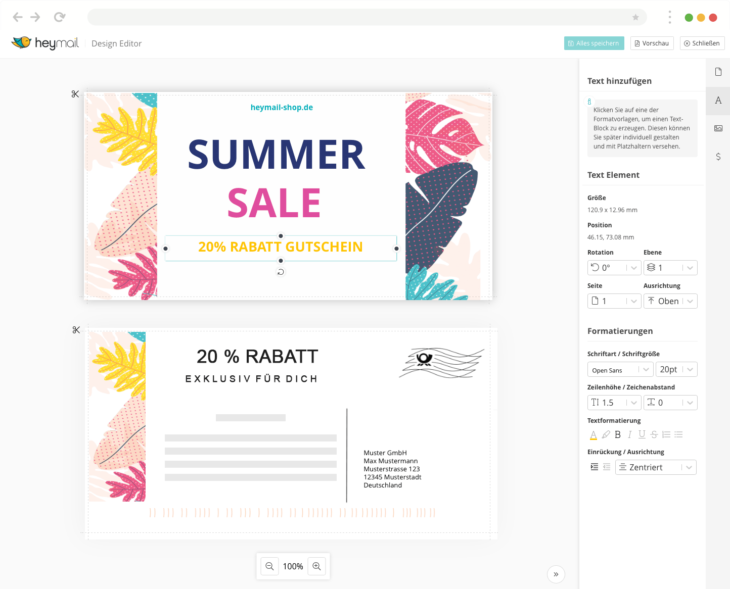 Mit dem Heymail-Editor kannst du deine Marketing-Postkarte ganz einfach online designen und zielgenau für jeden Empfänger personalisieren.
