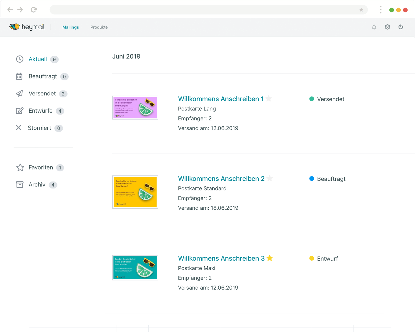 Mit Heymail musst du dich nicht um die Produktion, das Porto und die Einlieferung bei der Post kümmern. Du bestimmst lediglich das Versanddatum. Der Druck und der Versand aller Postkarten erfolgt automatisch zum gewünschten Termin.