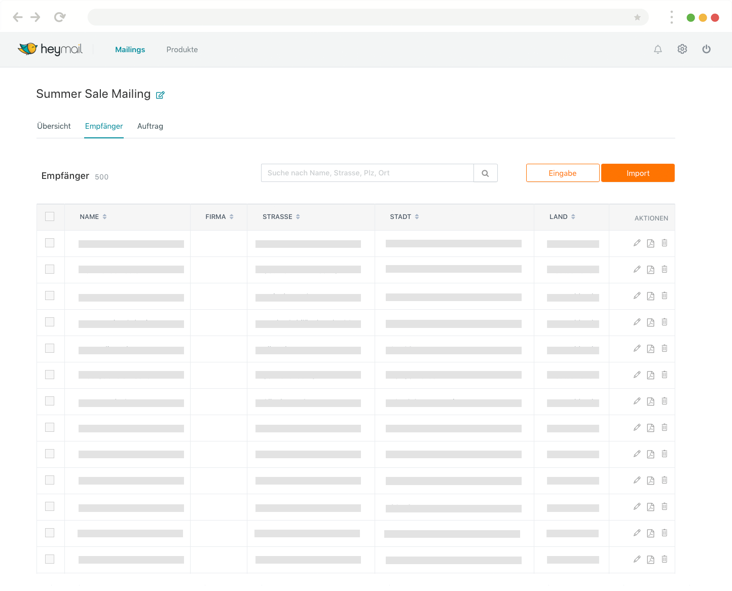 Empfängeradressen und individuelle Daten können einfach aus Excel oder anderen Datenquellen importiert werden. Heymail prüft automatisch die Vollständigkeit jeder Adresse. Darüber hinaus kannst du jede Postkarte genau so einsehen, wie der Empfänger sie erhalten wird.
